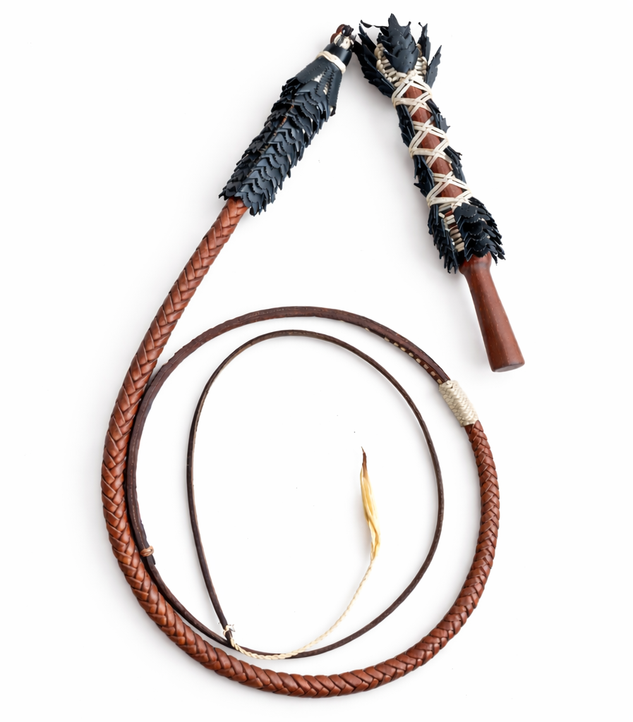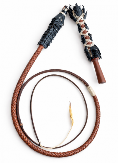 Ostor: Házilag készített bőrből fonott, 8 ágú fonás, hortobágyi kötésekkel